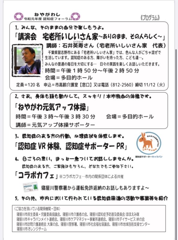 今日は寝屋川市保健福祉センターで認知症フォーラムを開催されていたので、見学に行ってきました。